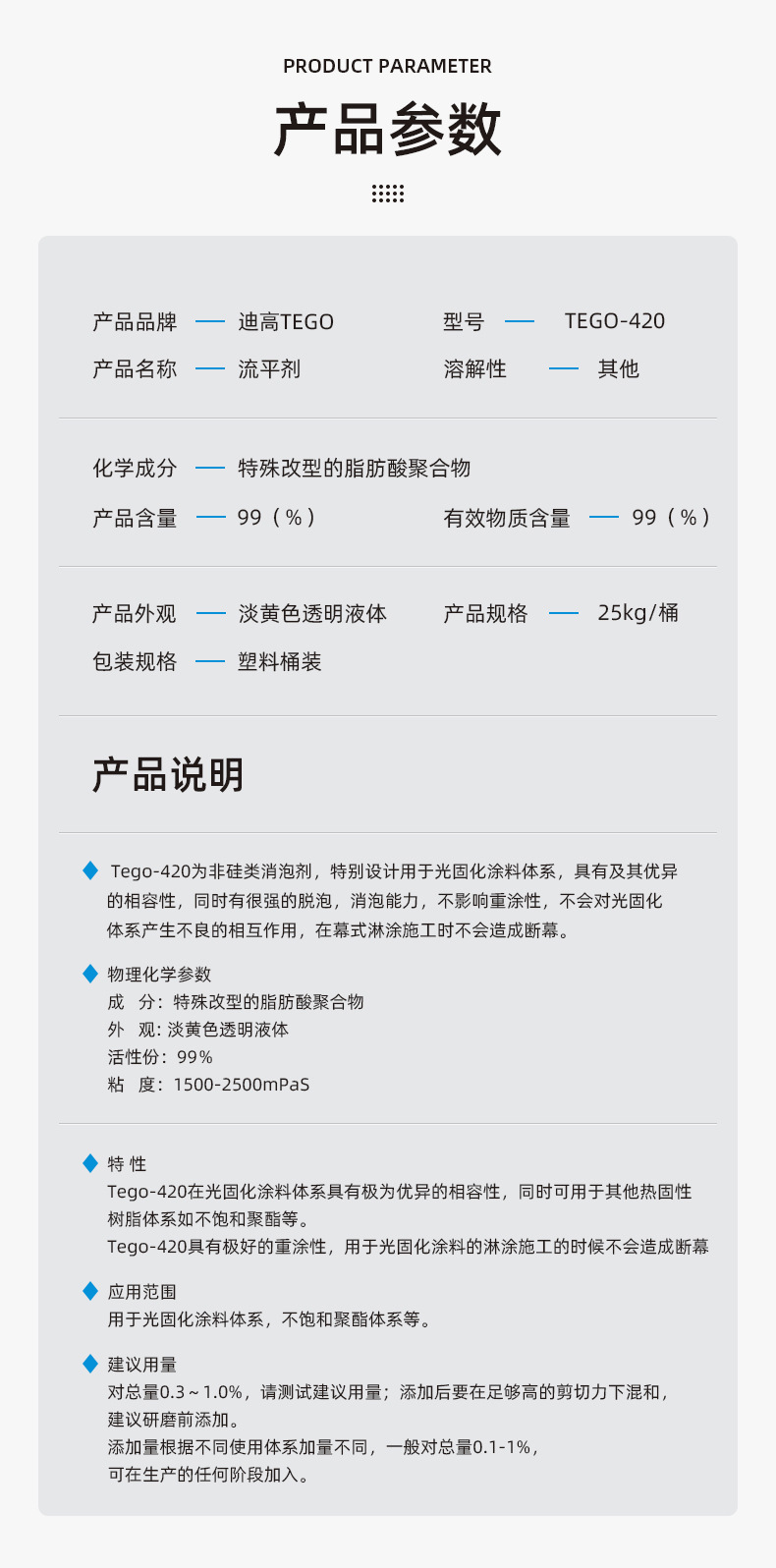 供应TEGO420 迪高助剂 用于光固化聚酯体系 流平剂420