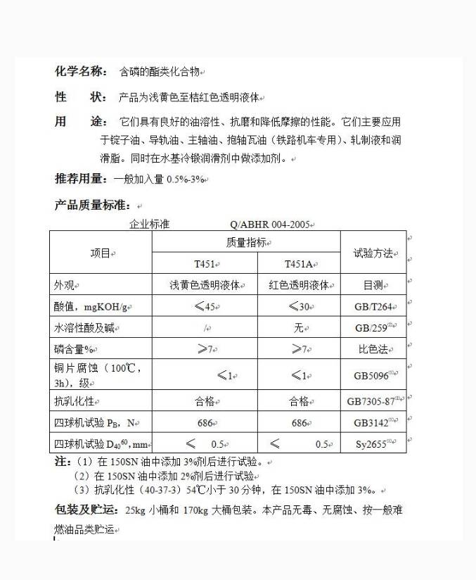 T451含磷的酯类化合物 具有良好的油溶性、抗磨和降低摩擦的性能